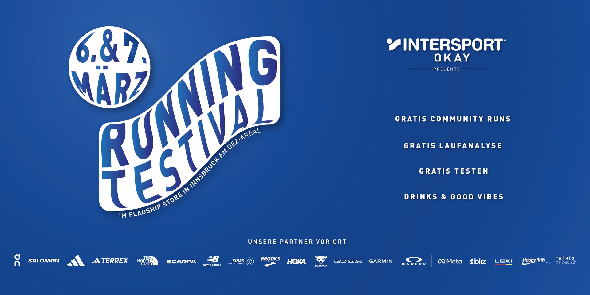 Am 6. & 7. März verwandelt sich der Vorplatz unseres Intersport OKAY Flagship Stores in Innsbruck zum zweiten Mal in ein Paradies für alle Laufbegeisterten! Bei unserem Running Testival hast du die Chance, gratis Laufequipment führender Marken zu testen, dich bei Community Runs mit anderen Läufer:innen zu vernetzen und von Workshops mit Profis zu profitieren. Dazu gibt’s Snacks, Drinks & gute Musik – die perfekte Mischung für ein sportliches Wochenende.