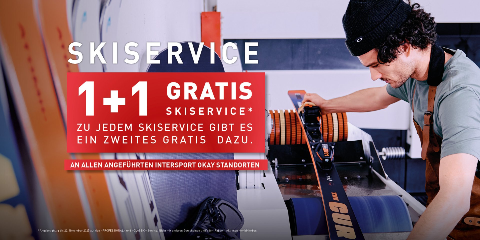 Bis 22. November 2025 profitierst du von unserer 1+1 GRATIS Skiservice-Aktion in allen INTERSPORT OKAY Filialen in Innsbruck, Völs, Wörgl, Vomp, Kufstein und St. Johann.*
